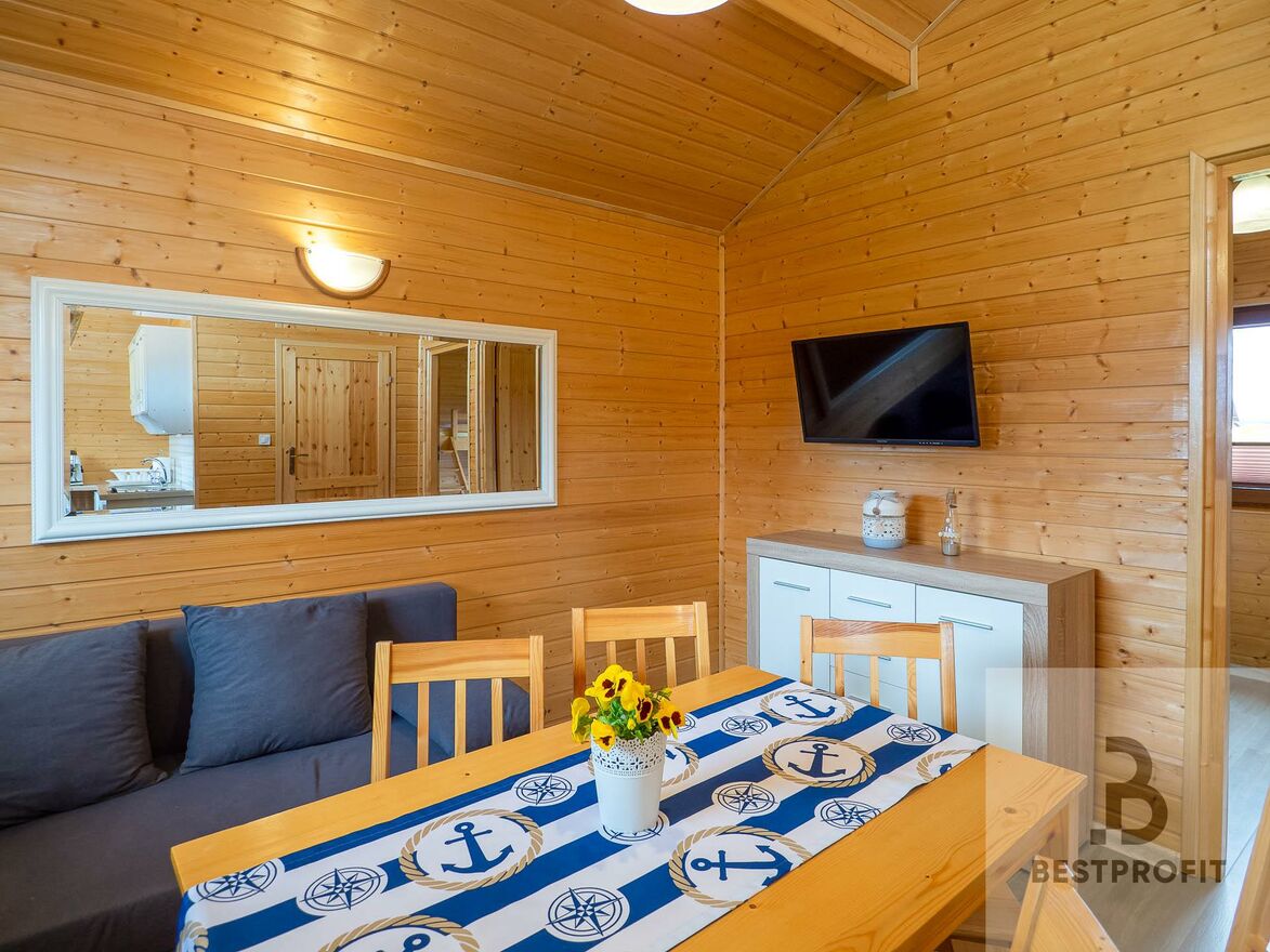 Domki są w pełni wyposażone i umeblowane, w cenie pozostaje kompletne wyposażenie kuchni, meble, pościele, ręczniki oraz sprzęt AGD.